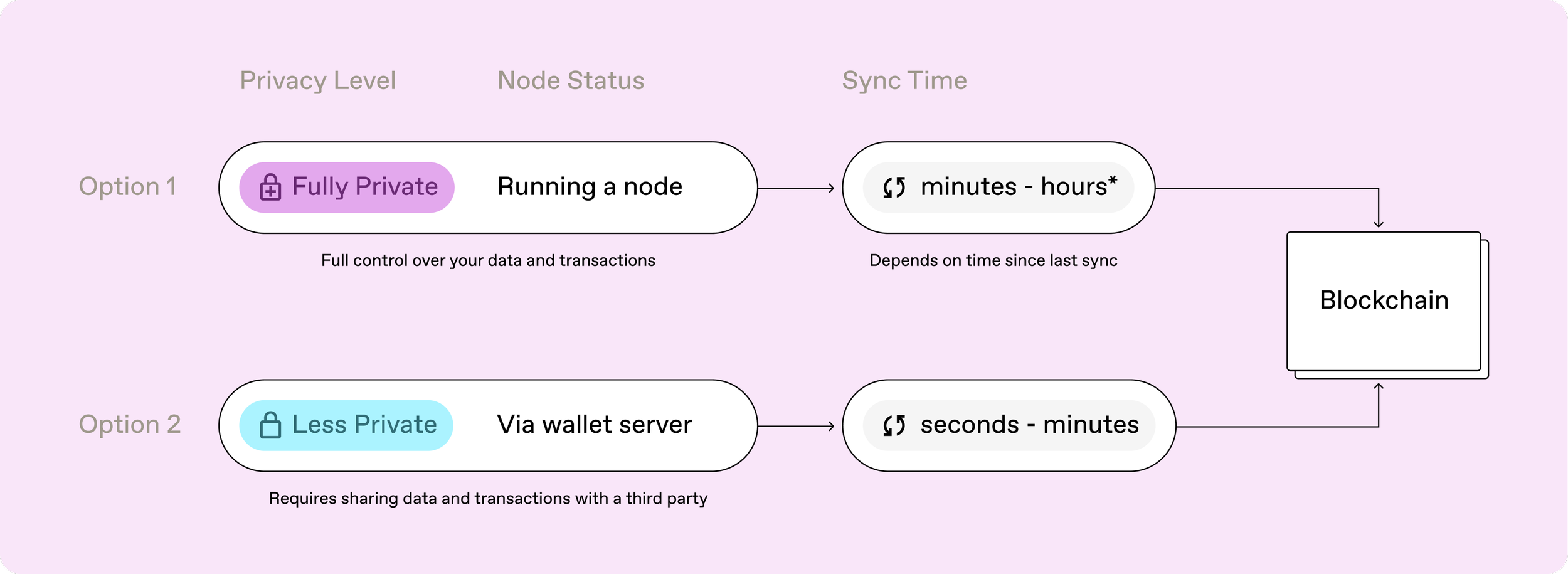 Less Private: Users connect to the Wallet Server, which acts as a proxy, offering faster sync speeds and more accessible privacy.